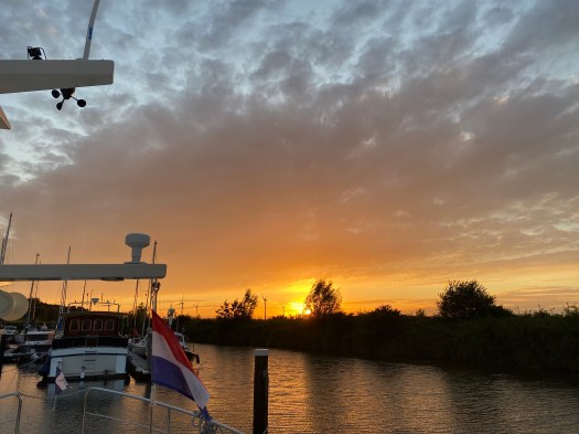 Freitag, 6.8.2021: Heute steht ein langer Schlag an: Da die Wettervorhersage schlecht ist, ist Willemstad als nächster Hafen angedacht. Ablegen um 8.18 und diesmal Frühstück auf der Fahrt. Es wird immer grauer um uns herum und wir erreichen schon nach 40 min den Abzweig in den Amsterdam-Rijnkanaal. Knappe vier Stunden Fahrt bringen uns um 12.50 über Utrecht zum Lekkanaal, wo wir vor der Schleuse kreuzen.