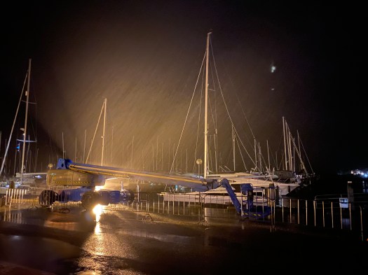 Man meint, mit den Bildern, es sei immer gutes Wetter gewesen…. Der Wechsel ging teilweise extrem rasch. Beide Extreme zeigen ein Bild des großen Bordhundes (Sturdy, darf schließlich nicht fehlen) sowie abends im Hafen: