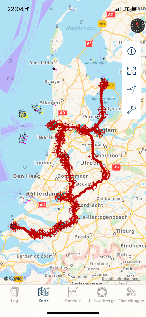 Um 10.50 legen wir ab – 25 min Wartesteiger an der Volkerraksluis. Diese ist damit nach einer Stunde passiert. 45 min Wartesteiger an der Krammersluis, wo es langsam voller wird. Die Grevelingensluis erreichen wir um 15.10 und müssen zunächst kreuzen, bis wir nach einer guten halben Stunde an den Wartesteiger können. Nochmal 45 min Warzeit obendrauf und endlich geht es in die letzte Schleuse. Diese ist um 17.00 passiert. Der Wind frischt weiter auf und erreicht nun 6-7 bft, in einzelnen Schauern ist die Sicht extrem schlecht. Radar? Kommt auch wieder auf die To-Do-Liste 😉