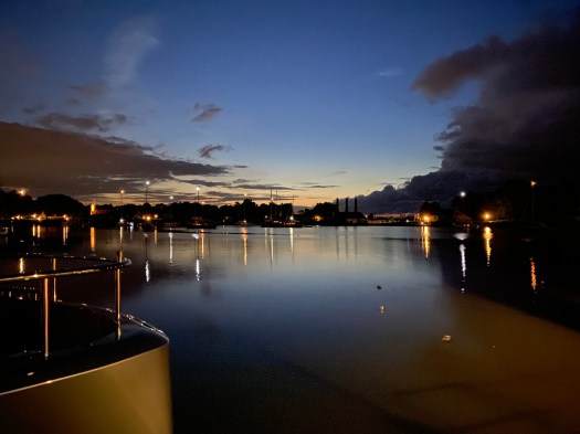Der Rest ist schnell beschrieben: 8.50 in die Schleuse, 11.40 Wartesteiger der Oranjesluizen bei Amsterdam und dann über das Markermeer und kurzen Aufenthalt am dortigen Wartesteiger um 17.10 letzter Schleusenvorgang des Tages. Im Compagnieshaven bekommen wir die letzte noch freie Box – optimal für die Hunde und mit obigem schönem Ausblick auf V-Steiger. Allerdings gestaltet sich die Anfahrt nicht so leicht bei mässigem Wind und relativ eng stehenden Dalben.