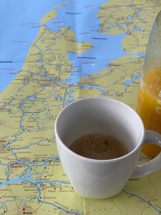 Amsterdam / Ijmuiden und dann das nördliche Ijsselmeer, ggf. mit sportlichem Stop auf Texel werden schließlich favorisiert und somit geht es um 11.15 nach ebenfalls wieder ausgedehntem Frühstück los. Über die Hollandse Ijssel geht der Weg nach Gouda, Alphen a.d.Rijn. Dort wird dann um 16.00 ein Stop für eine Hunderunde definitiv erforderlich. Wenig Wind, dafür umso mehr Regen und Brücken mit mässigen Wartezeiten begleiten uns.