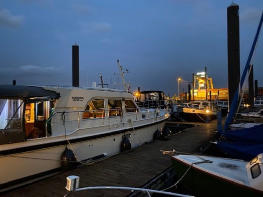 Bei unserer Ankunft erhalten wir vom Hafenmeester die Auskunft, dass an der Kade im Stadthafen noch ein Platz frei sei. Bei 1-2 bft Wind ist es kein Problem, in diese wirklich enge Lücke herein zu manövrieren. Kaum 30 Minuten dort fest liegend, füllt sich der Hafen zunehmend, der neue Passantenhafen war schon bei unserer Ankunft voll belegt. Eigentlich kennen wir es sonst eher umgekehrt. In der hereinbrechenden Dunkelheit hören wir auf einmal das „sonore“ Geräusch von Querstrahlrudern und den Ruf: „Ach, die kennen wir ja!“. Um die Ecke kommt die Grand Bleu, ehemaliges Boot unserer Hamburger Freunde und nun unter Schweizer Flagge fahrend (nebenbei in unserem Heimathafen zwei Plätze weiter liegend – wir kennen nunmehr alle Namen dieses Boots). Eine kurze freudige Begrüssung und wir haben die vollausgestattete Linssen GS 470 MK II im Päckchen an uns festgemacht. Die Nacht kann kommen.