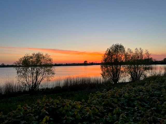 Vorbei ist’s mit dem Ausschlafen – wir starten um 7.40 mit der aufgehenden Sonne aus der Marina Kerkdriel auf die Maas.