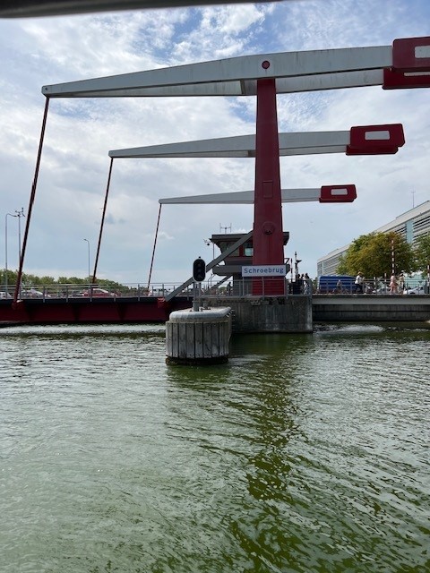 Was ist da das Problem? Eigentlich gar keins, aber die Zeiten sollen zu unseren weiteren Vorhaben passen. Da die Dokbrug in den neuen Hafen am Scheldekwartier (hier war eine Liegeplatzreservierung und Bezahlung über die i-Marina – App absolut problemlos) für uns passend nur um 14.30 öffnet (davor zuletzt um 11:25 und danach erst wieder um 18.30) müssen wir den Blauwe Golf zur rechten Zeit nutzen. Der Blauwe Golf ist eine koordinierte Öffnung der Brücken für die Sportschifffahrt über den Kanaal door Walcheren zu festgesetzten Zeiten. Er beginnt in Richtung Vlissingen an der Stationsbrug in Middelburg, in die umgekehrte Richtung an der Keersluisbrug in Vlissingen. Hiermit ist die Passage der insgesamt 5 Brücken auf der Strecke in einer guten Stunde möglich.