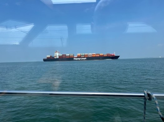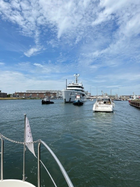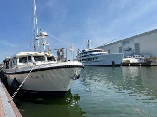 Um 10.30 heisst es daher Leinen los, heute steuert die Skipperin den ersten Part bis Vlissingen. Ruhige Überfahrt über die Westerschelde und ohne Wartezeit geht es um 12.15 in die Schleuse. Gut 20 Minuten später begegnen wir bei der Ausfahrt einer der Superyachten, die aus der Damen-Werft geschleppt wird.