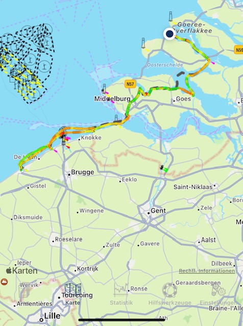 Das Boot ist allzeit gut beherrschbar und der Wind flaut etwas ab auf 4-5 bft. Etwa eine halbe Stunde nach der Passage von Zeebrugge wird es damit ruhiger. Dort ist es jedoch noch richtig aufregend, denn zwei grosse Fähren und vor allem schnellfahrend das Militär kreuzen unsere Route und zwingen uns zum Beidrehen. Mit dem Autopiloten wäre die Fahrt sicherlich weniger steuerintensiv geworden. Mit Rücksicht auf das Befinden der Crew ist jedoch permanent manuelle Steuerung angesagt.