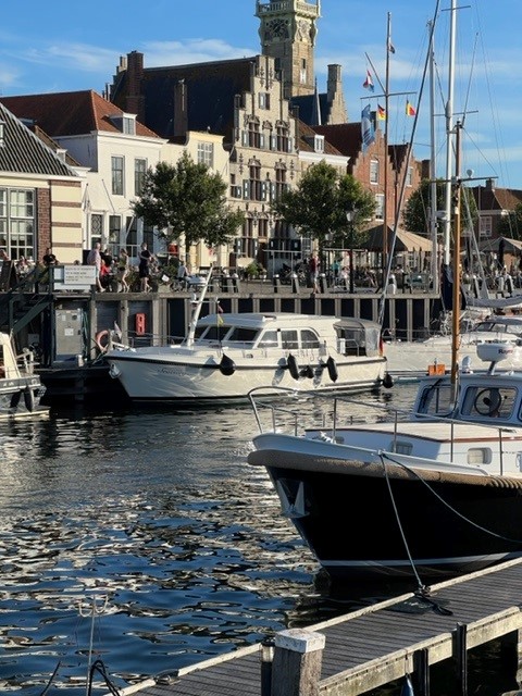 Bei der Ausfahrt kreuzen uns unzählige Ruderboote, deren Besatzung mit mehr oder weniger sportlichem Einsatz am Werk ist: Es sind die Visserijdagen, die uns einen schönen Anblick auf die Ruderer sowie die geschmückten Fischerboote liefern. Vorbei am immer wieder schönen Panorama der Zeelandbrücke geht es Richtung Kats, um durch die Zandkreeksluis ins Veerse Meer zu gelangen. Die Wartezeit hier ist sogar nur 20 min, so dass wir um 14.15 in der Schleuse sind. Zwei Stunden später ist das wunderschöne Städtchen Veere erreicht und der Hafen scheinbar komplett belegt. Von der Hafenkade ruft uns der Hafenmeister zu, dass kein Platz mehr sei. Wir haben jedoch über die i-Marina – App eigentlich Platz 3A schon lange reserviert und auch bezahlt, was wir nachweisen können. Also wird zum Glück „unser“ Platz doch frei und wir liegen zum Abend dann sogar ohne weitere Nachbarn – diese sind gegen 20.00 aus welchem Grund auch immer aufgebrochen. Koffie stellt unterdessen bei der Abendrunde fest, dass sie keine Live-Musik mag und kontert diese mit einem Bellkonzert …