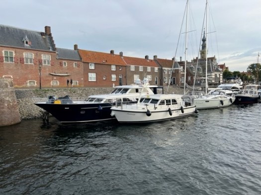 Die Fahrt geht nach knapp 1,5 Stunden Pause weiter Richtung Veere, wo wir wieder einen Platz reserviert haben. Gleichzeitig wollen dort auch viele andere Boote hin und nach der Schleusenausfahrt beginnt ein wildes Rennen, wer zuerst am Hafen ankommt. Uns beeindruckt das im Wissen um die bereits erfolgte Reservierung und Bezahlung nicht. Um so größer ist das Erstaunen, als uns der Hafenmeister diesmal mitteilt, er habe den Hafen einfach trotzdem schon mit anderen Booten voll gemacht und wir könnten ja an eine Muringboje gehen. Mit dem vehementen Hinweis auf unseren erneut bezahlten Liegeplatz und die zwei an Bord befindlichen Hunde, die wir schlecht schwimmend Gassi führen können, wird uns schließlich das Festmachen an einer großen Yacht direkt an der Hafeneinfahrt gestattet. – hinter uns ist alles voll in 2er bis 4er – Päckchen. Der direkte Blick aufs Veerse Meer entschädigt dann etwas für diesen Ärger. Von Badeplattform zu Badeplattform können die Hunde gut an Land gehoben werden.