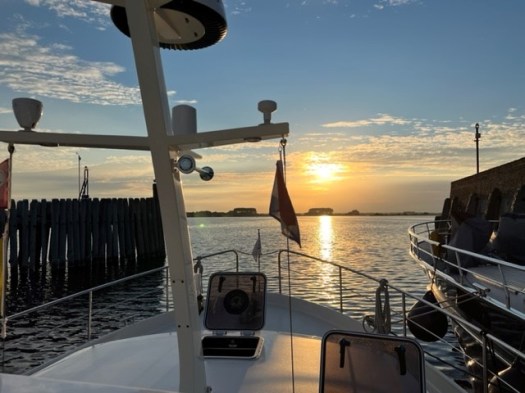 Und dennoch beginnt der nächste Fahrtag erst um 11.15. Warum? Wegen der Öffnungszeiten der Dokbrug und weil ja zuerst das Auto noch in den Heimathafen verholt werden muss. Der Job des Skippers beginnt damit an Land im Auto und danach im Bus. Aus dem AH – Supermarkt direkt am Hafen noch frische Croissants für’s Frühstück und einen Prosecco mitgebracht, starten wir dann.