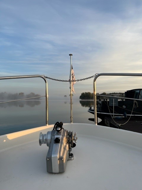 Die 40.9 läuft stabil und sicher und ist problemlos steuerbar. Die von uns nachgerüstete elektronische Schaltung und die Stabilisatoren tragen zum Wohlgefühl und der einfacheren Manövrierbarkeit bei, bedürfen jedoch noch ein wenig der Feinjustierung. Der Platz für zwei bis vier Reisende reicht gut aus. Die Pantry zu optimieren, da vor allem der Skipper gern kocht, ist das nächste Ziel. Gleiches gilt für die Persenning, um den wirklich schönen Lebensraum der Pflicht zu optimieren. Der fehlende Komfort bei Anlege- und Schleusenmanövern durch die schlechte Erreichbarkeit der Heck-Klampen muss dabei in Kauf genommen werden. Über die mittlere Klampe liegt das Boot zunächst optimal stabil und dann können in Ruhe alle anderen Leinen ausgebracht werden. Unsere installierte GSM-Antenne funktioniert wunderbar – ob wir noch irgendwann eine Satellitenschüssel installieren, steht in den Sternen (eher nicht… mit Blick auf die schönen vergangenen Abende der letzen zwei Jahre)..