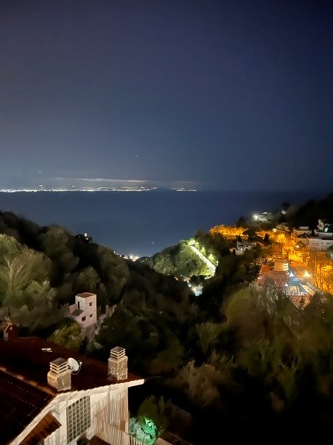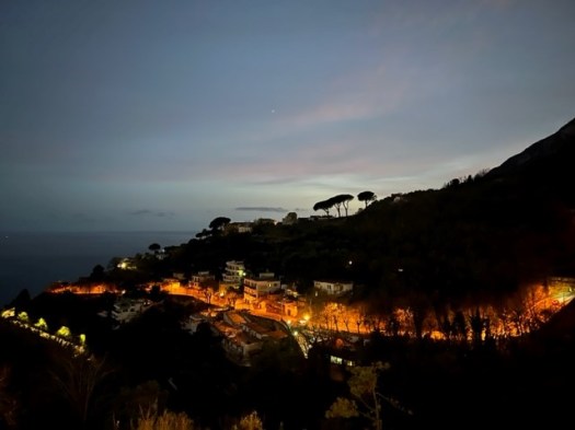 Bei der Erklärung des Appartements fühlten wir uns wie im Hafen: Bullaugen-ähnliche Fenster und vor allem zig Erläuterungen, dass die Absicherung schlecht ist, also: entweder Klimaanlage oder Heizung oder Herdplatte und dort immer nur eine und nie auf volle Leistung“ und „nie mehr als WC-Papier einlagig in die Toiletten“ kennt man ja nun und als wir verständig all dies bekräftigten, war die Stimmung perfekt. Es war aufgrund der relativ gemütlichen Abreisen jeweils nach 10.00 schon relativ spät und so entstand nach dem Ausladen des Autos das obige Photo von unserem Balkon – Blick Richtung Vietri / Salerno.