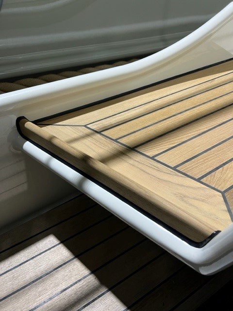 Da an den Gangborden trotz Persenning immer Wasser in die Pflicht lief, haben wir die Stufen teaken lassen – die Kante hält viel Wasser ab und es ist auf einen Schlag trockener in der Pflicht, vor allem bei Starkregen.