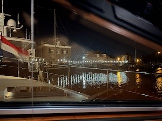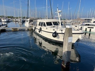 Eigentlich lief bis hierher alles unspektakulär. Die Hafenmeisterin hatte uns schon angekündigt, dass noch eine größere Yacht eintreffen wird, daher sollten wir soweit wie möglich in die vordere Ecke des Hafenbassins vorfahren. Sie ist schon in ihrem wohlverdienten Feierabend, als dieses Boot dann auch auftaucht – es aber nicht schafft, hinter uns an die Kade zu kommen. Mit wildem Gestikulieren fragt uns der britische Skipper, ob wir unser Boot nicht nach achtern verholen und ihm den vorderen Platz freimachen können. Gesagt, getan: wir wollten zwar eigentlich gerade den gemütlichen Teil des Abends einläuten – starten jedoch sicherheitshalber die Motoren, um die Querstrahlruder zur Verfügung zu haben. Eigentlich verholen wir das Boot lediglich mit den Leinen. Aufgrund der Bewegungen der anderen Yacht erscheint es uns aber sicherer, im Falle eines Falles mit Motorkraft eingreifen zu können.