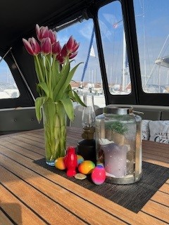 Es ist zwar sonnig, aber noch sehr kalt und immer wieder kommen Regenschauer dazu. Die Bilanz des ersten Törns: 26,5 Motorbetriebsstunden, 8 Generatorstunden sowie 120 Stunden, in denen die Dieselheizung wirklich erforderlich war. Auf der Maas waren wir im Schnitt mit 1600 rpm, auf Waal und Hollandsch Diep mit 1600-1800 rpm, auf Volkerrak und Krammer mit 1800 rpm und auf dem Grevelingenmeer mit 1800-2000 rpm unterwegs.