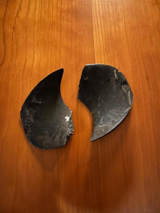 Dies sind die abgebrochenen und nicht im Hafenbecken untergegangenen Blätter des SB-Propellers der Heckschraube. Das Landstromkabel ist nach dieser Aktion nur noch ca. 7m lang. Große Teile der Isolierung sind nicht mehr intakt, so dass wir mit Hilfe unseres technisch versierten Gasts an Bord am noch intakten Kabel den Stecker neu montieren um zumindest übergangsweise den Landstrom nutzen zu können.
